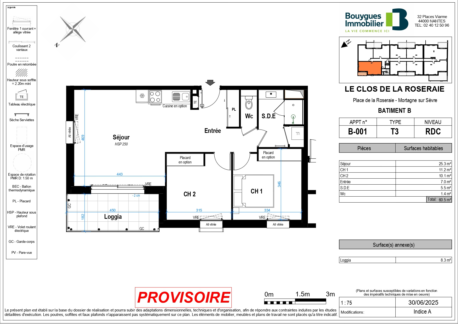 Résidence Le Clos de la Roseraie composée de logements du 2 au 4 pièces, répartis sur deux bâtiments. Dont 3 appartements de 3 pièces, de 61m² 64m² et compris entre 209000€ et 224000€.