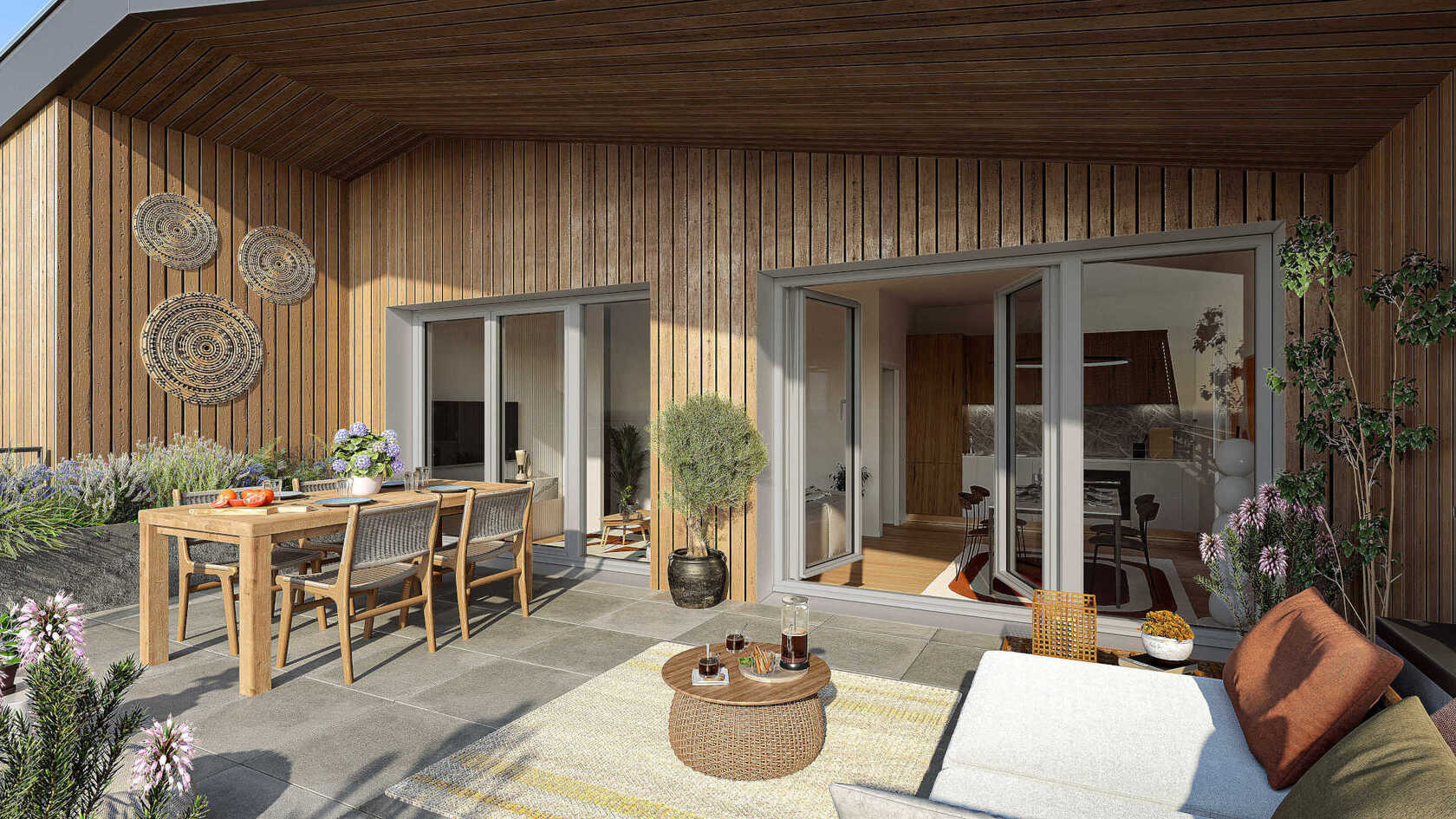 Chaque logement dispose d’un espace extérieur privatif sous forme de balcon, terrasse ou jardin. La résidence est implantée sur une parcelle de plus de 2 800 m².
